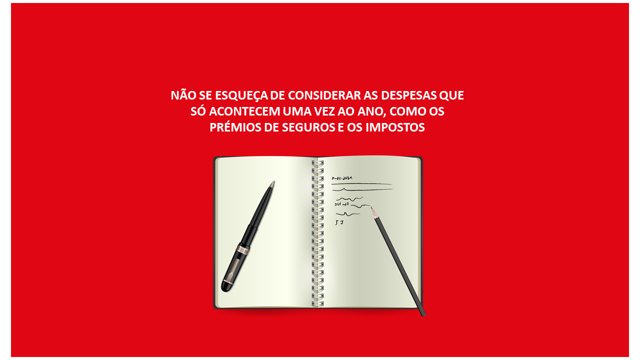 - Na realização do orçamento seja detalhado, não se esqueça de considerar as despesas que só acontecem uma vez ao ano, como os prémios de seguros e os impostos (IMI, IRS, Quotas de Associações/Clubes entre outros).