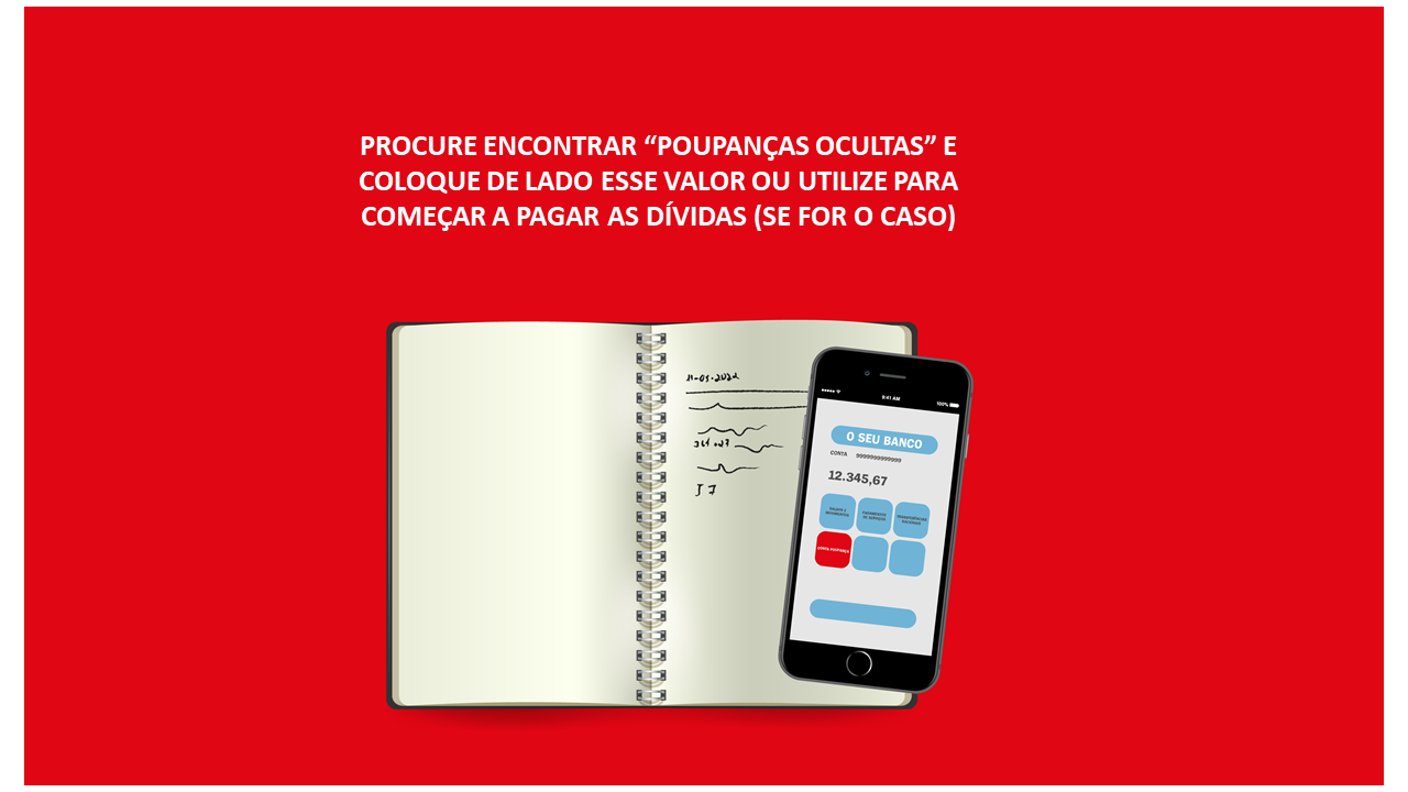 - Procure encontrar “poupanças ocultas” e coloque de lado esse valor ou utilize para começar a pagar as dívidas (se for o caso) – renegocie os contratos de seguros, telecomunicações ou outros. Encerre as contas bancárias que não usa e, se fizer sentido, converta a sua conta bancária numa conta de serviços mínimos bancários.